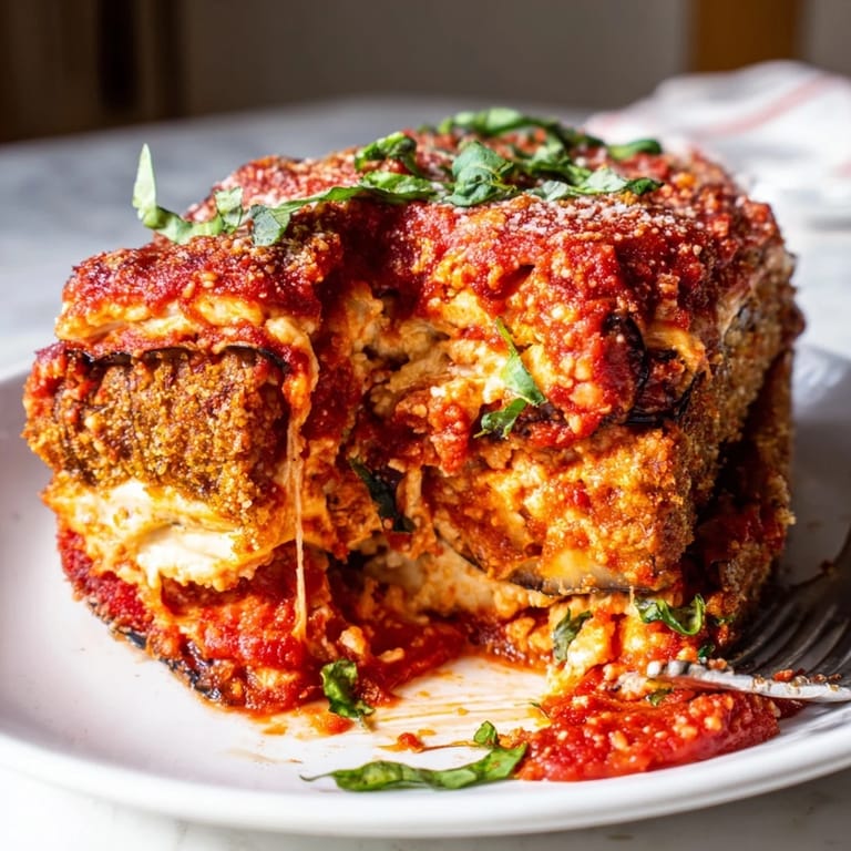 Save A comforting Italian-inspired casserole layering tender eggplant with rich tomato sauce, creamy ricotta, gooey mozzarella, and a golden Parmesan crust. Perfect for family dinners or gatherings.