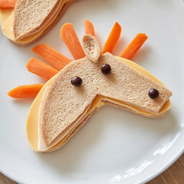 Julienned carrot strips arranged along the neck or top of the bread cutout simulate a colorful mane.