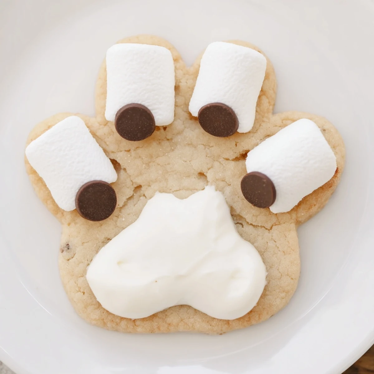 - Spread a thin layer of melted white chocolate on each cookie. Press a large marshmallow near the bottom edge of each cookie for the paw pad.