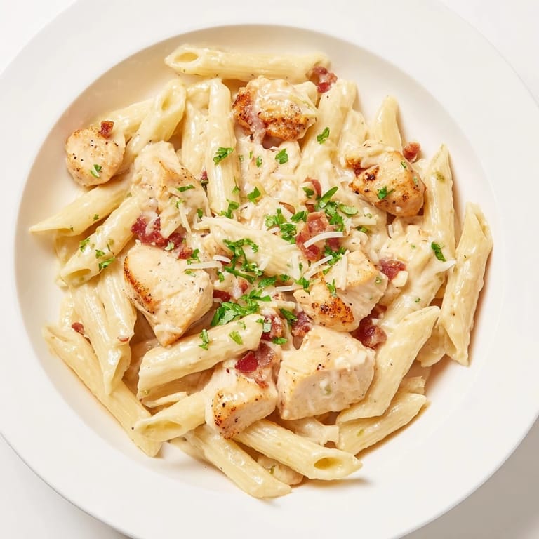 Save A creamy flavorful pasta dish featuring tender chicken crispy bacon and a homemade ranch-infused sauce tossed with penne. Perfect for a comforting weeknight dinner.