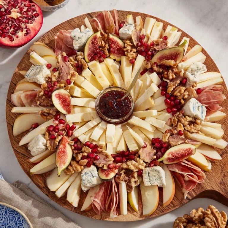 Cheeses are placed centrally in a star shape, cured meats fan out around them, with fruits, nuts, and sweets filling spaces for a festive presentation.