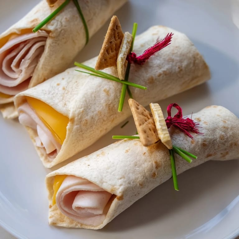 - Lay out a tortilla and spread a thin layer of cream cheese over the surface. Place a slice of deli meat (or cheese for vegetarian) and a slice of cheese on top. Roll up the tortilla tightly into a log, then cut in half to create two diplomas. Tie each wrap with a chive stem or green onion top to resemble a diploma scroll. Repeat with remaining tortillas and fillings.