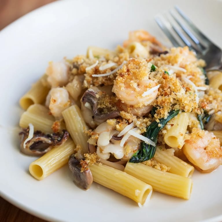 Save A comforting fusion dish featuring tender pasta, assorted seafood, and a creamy, umami-rich sauce topped with golden panko breadcrumbs and baked to perfection.