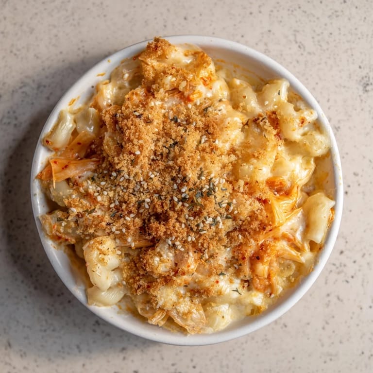 Save A bold and creamy comfort classic reimagined with tangy kimchi, melty cheeses, and a crunchy sesame topping, Spicy Kimchi Mac & Cheese is a fusion main dish inspired by Tineke Younger that has become a viral sensation.